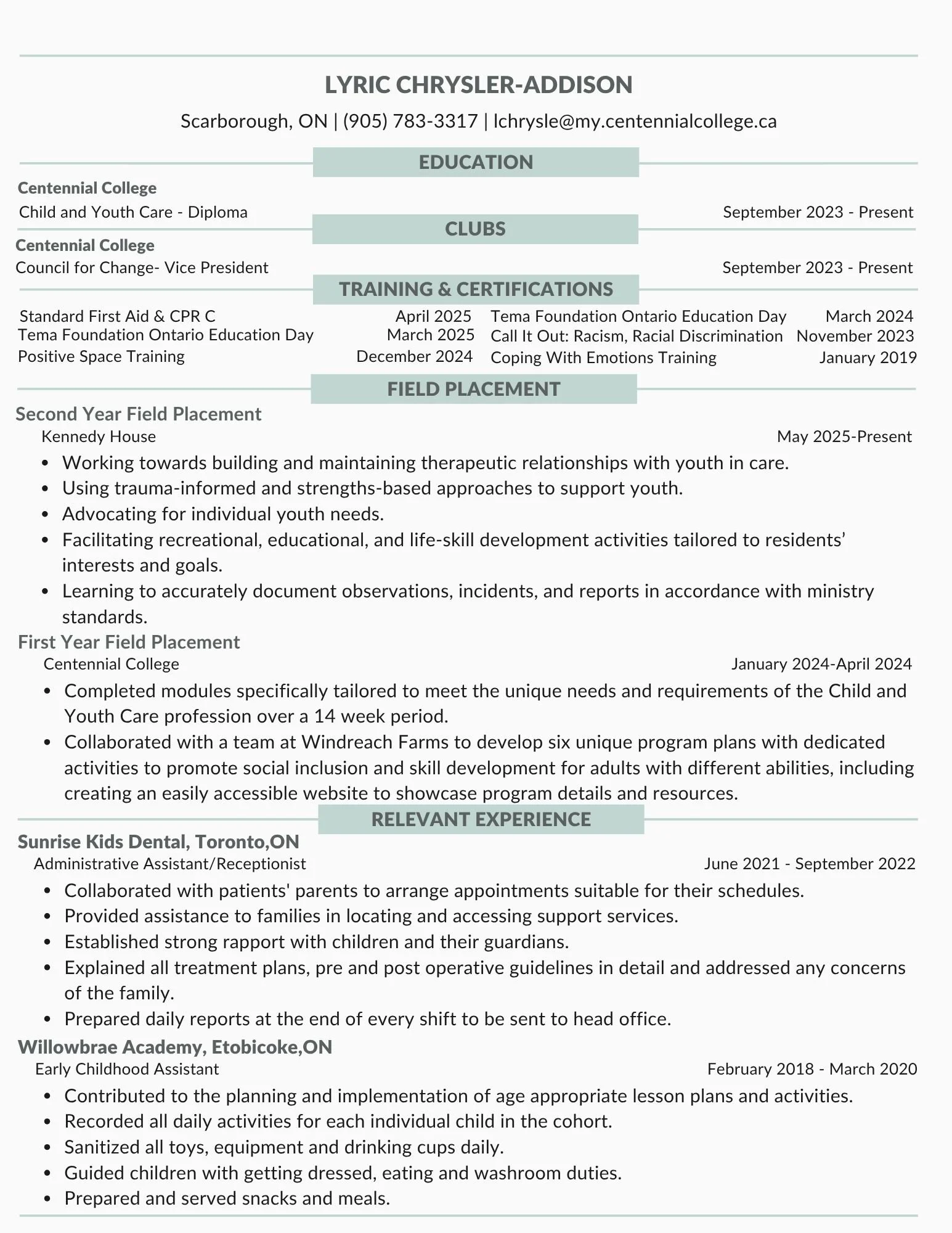 My resume provides an overview of my academic background, and field placement experience. It highlights my hands-on work in residential care, and my school involvement. It reflects my growth as a developing professional and my readiness to contribute to supportive, youth-centered environments. Please note that is resume is a two-paged document.