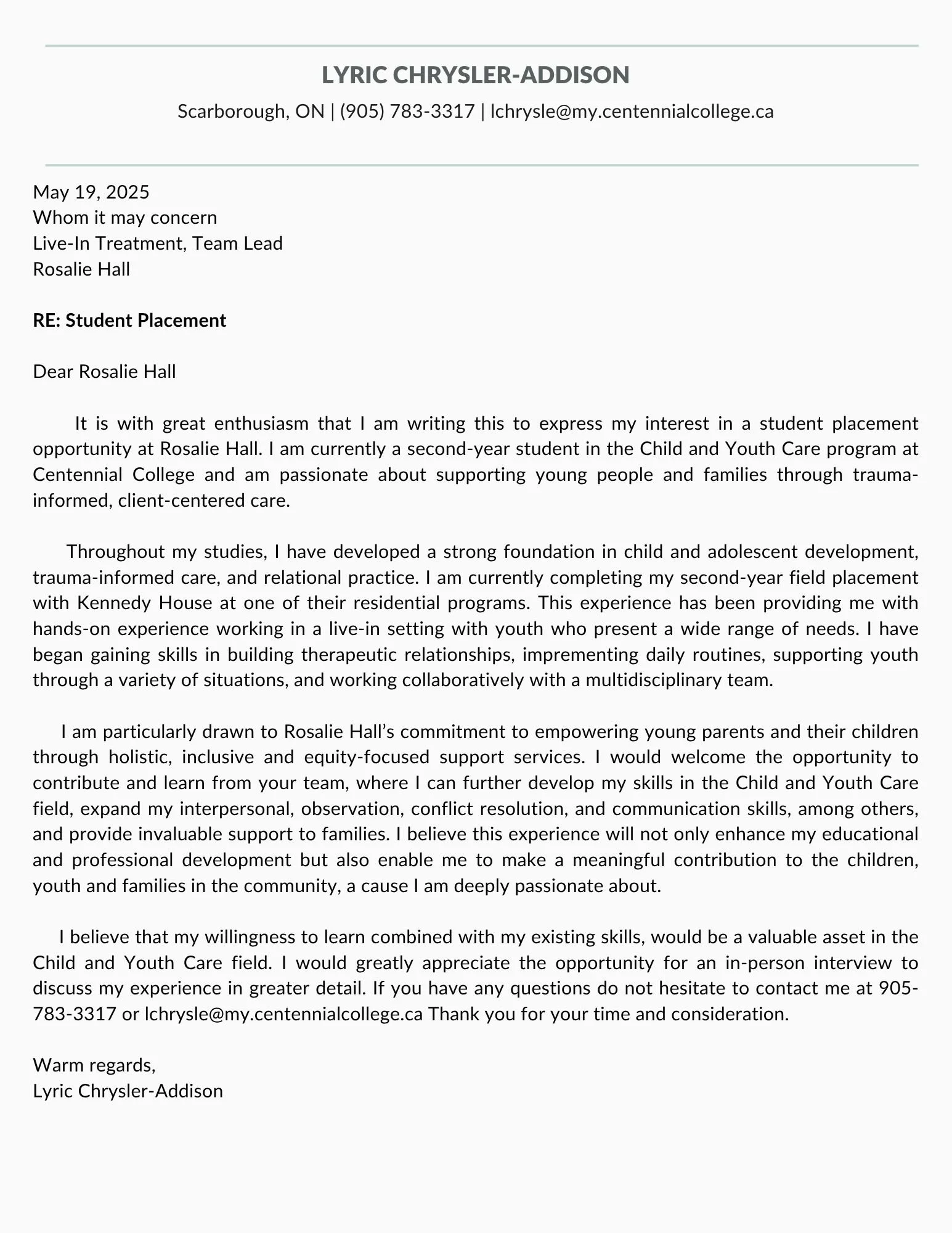 This cover letter was created to highlight my passion for Child and Youth Care and my readiness to contribute meaningfully to the field. It outlines my educational background, and placement experience.