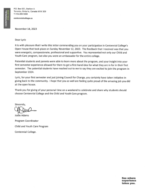 This letter was provided by one of my professors in recognition of my involvement as a student ambassador during a Centennial College Open House event. I had the opportunity to represent the Child and Youth Care Practitioner program by engaging with prospective students, sharing my experiences, and answering questions about the field. This experience reflects my commitment to the CYC profession, my enthusiasm for mentorship, and my ability to communicate effectively in a professional setting. I’m proud to contribute to building interest in a field that I am passionate about.